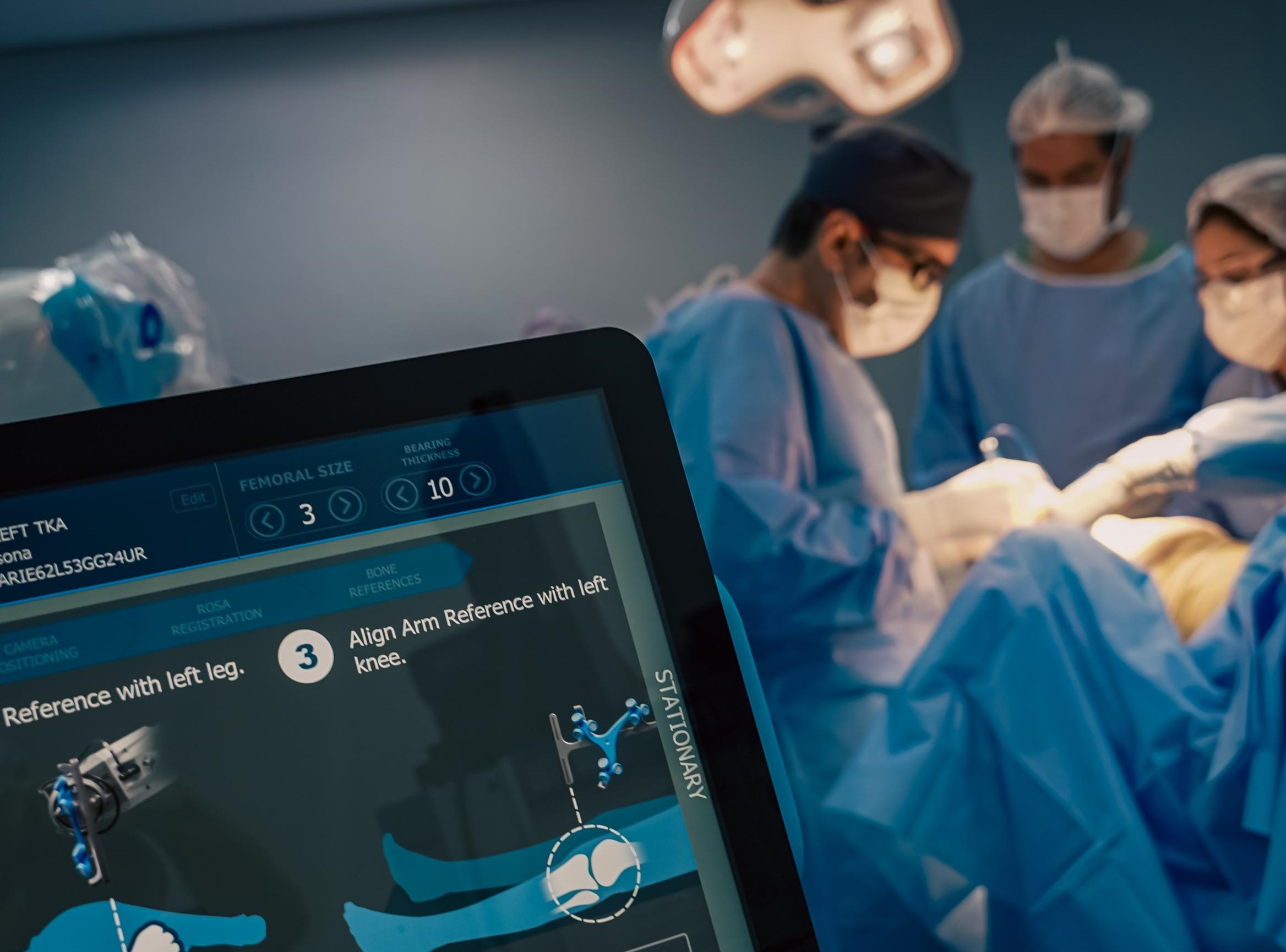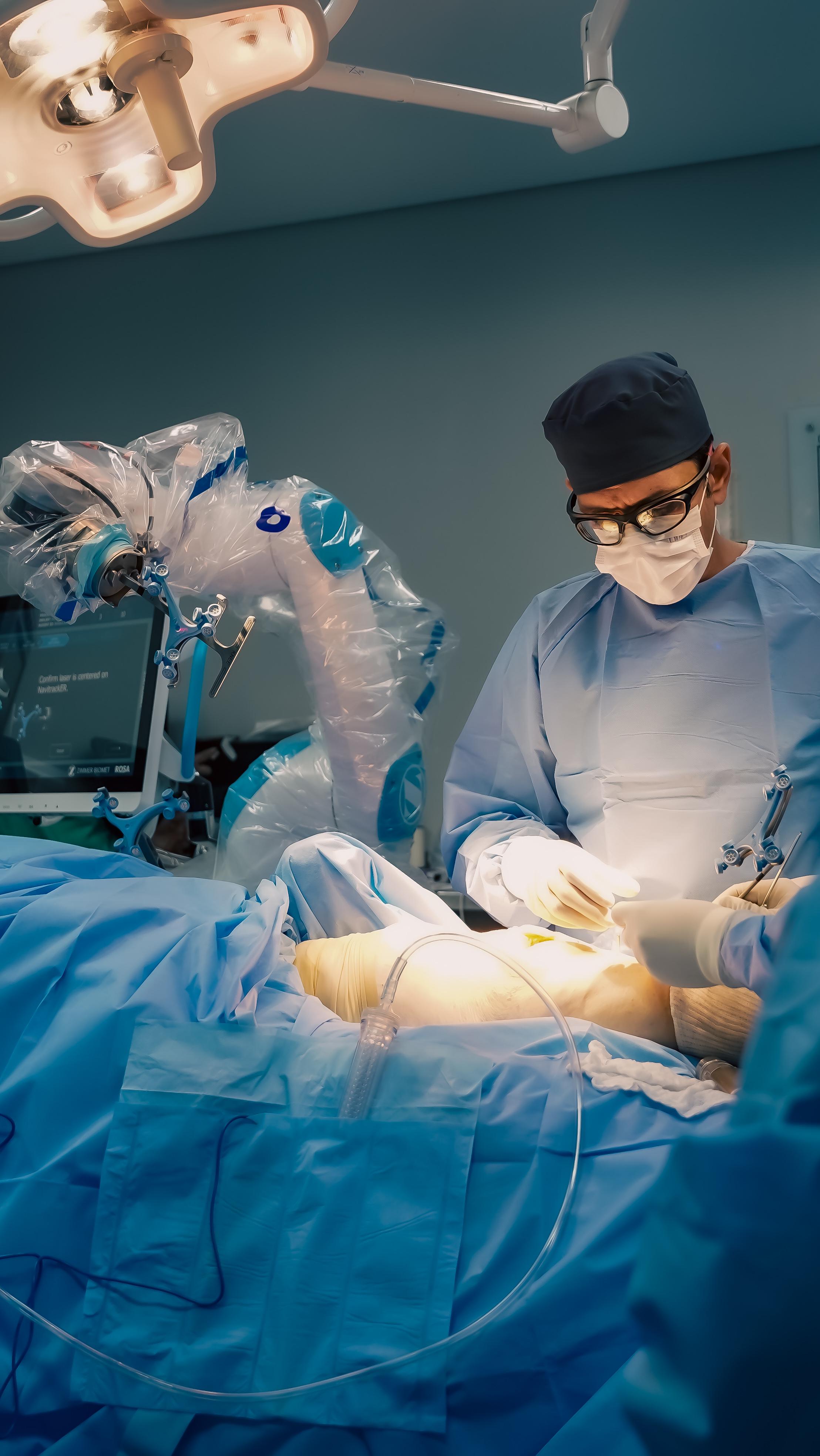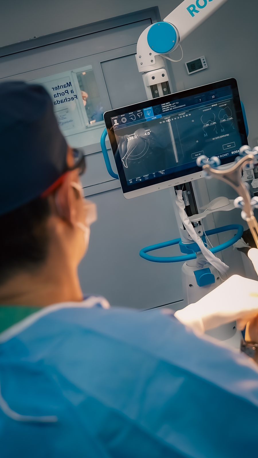 planejamento cirúrgico com precisão e segurança. Com tecnologia de ponta, melhora os resultados e acelera a recuperação dos pacientes. É uma tecnologia inovadora que fornece informações importante dos tecidos moles e ressecções ósseas precisas, com o objetivo de restaurar o joelho natural do paciente. Durante a cirurgia, esse robô coleta métricas intra-operatórias para auxiliar na tomada de decisões e fornece dados que são fundamentais para o cirurgião alcançar o melhor resultado para cada paciente.